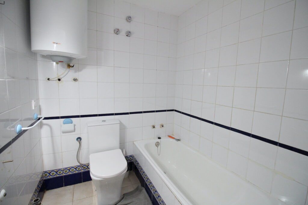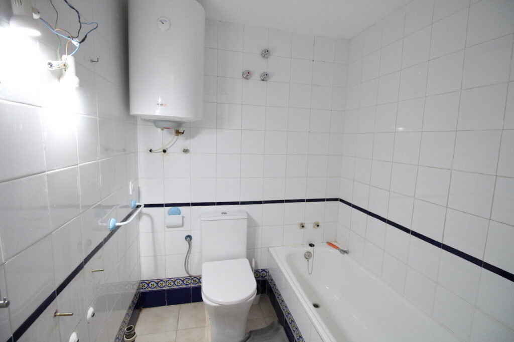 The bathroom felt cramped and inefficient. There was no proper storage for cleaning supplies, and the old wall tiles made the space look even smaller and darker. The bulky bathtub dominated the room, limiting movement and usability.