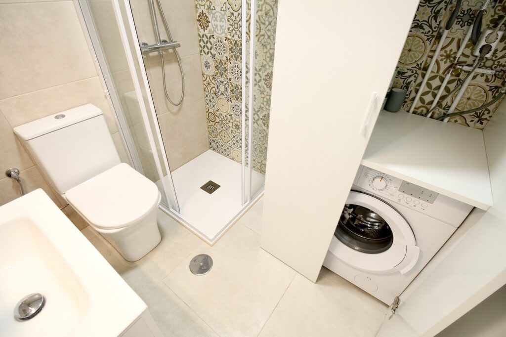 - The new design cleverly hides a washing machine inside the closet, keeping the bathroom clean and uncluttered.